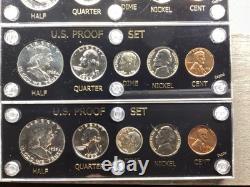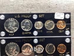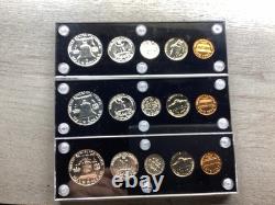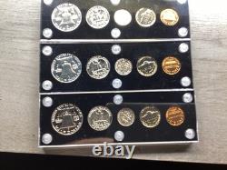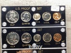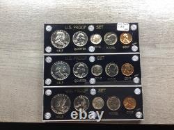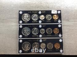 Mint Silver Proof Set includes Lot of 3 complete sets. Each set contains 5 uncirculated Proof coins denominations ranging from 1 cent to 50 cents. The Franklin, Washington and Roosevelt are composed of 90% silver.