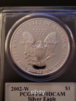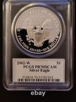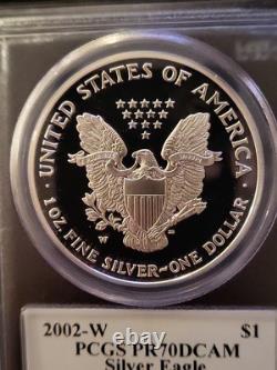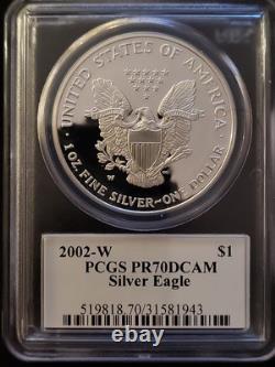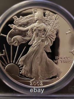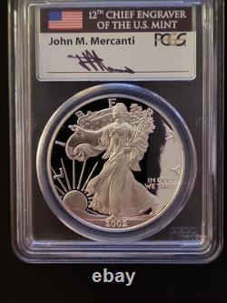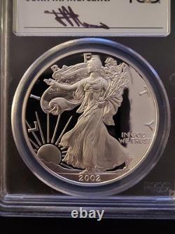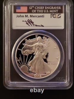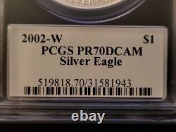 This is a 2002 American Eagle 1 oz Silver coin certified by PCGS as PR 70. Designed by John Mercanti, it features a proof strike type with a fineness of 0.999.