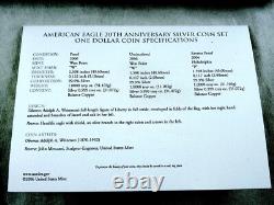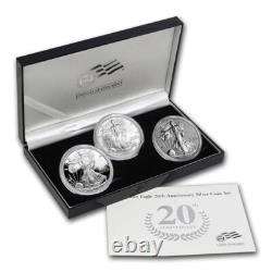 This 2006 Silver Eagle 20th Anniversary 3 Coin Set is a stunning addition to any collection. The set features three 1 oz silver coins with proof strike type and a fineness of 0.999.
