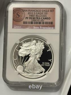2012 (S) American Silver Eagle - NGC PF70 Ultra Cameo - First Releases - San Francisco Mint??? This flawless 2012 (S) Proof Silver Eagle is graded PF70 Ultra Cameo by NGC, earning the coveted First Releases designation. Struck at the historic San Francisco Mint, this coin features the iconic Walking Liberty obverse and heraldic eagle reverse in brilliant mirror-like fields and deeply frosted devices - classic Ultra Cameo contrast. Grade: NGC PF70 Ultra Cameo.
