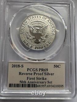 The product is a 2018-S Kennedy Half Dollar from the 50th Anniversary Set, graded PR 69 by PCGS. It is a 1 oz silver coin with a fineness of 0.900, struck in proof style. The certification number is 36218205 and it is a First Strike coin. The coin is minted by the U.