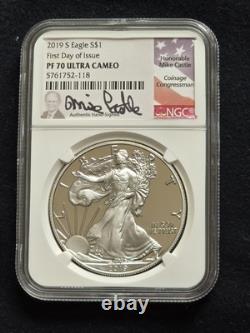This rare 2019 S Proof American Silver Eagle Proof coin is certified by NGC as PF70 and Ultra Cameo. With the Signature of Mike Castle. This coin is made of 0.999 fine silver and contains 1 ounce of precious metal content per unit.
