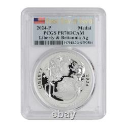 Mint Box and Certificate of Authenticity. 100% RISK FREE SATISFACTION GUARANTEE. 2024-P 1oz Silver Liberty and Britannia Medal Proof graded PR70DCAM First Day of Issue by PCGS with Original Mint Box and CoA. Photo shown is an example of our 2024-P 1oz Silver Liberty & Britannia Medals PCGS PR70DCAM FDOI with OGP.