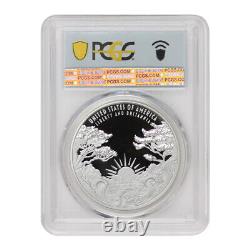 This silver medal is intended to show the long and storied relationship between America and the United Kingdom. The obverse depicts both Lady Liberty, holding a torch, and Britannia, wielding a trident. The reverse shows the sun rising over the Atlantic Ocean and the two shores that separate us. Two trees, a Bristlecone Pine and an English Yew, grow on each shore; a sign of continuing partnership and friendship.