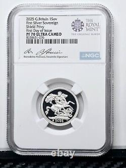 First Edition First Day of Issue Proof Silver Sovereign with Shield Privy G. Raded PF 70 by NGC. This is the 2025 Silver Sovereign's FIRST YEAR OF ISSUE! This 2025 Silver sovereign has the coveted shield privy mark and is graded a PERFECT PF 70 by NGC. The certificate has a facsimile signature of the original designer Bernedetto Pistrucci who died long ago.