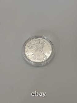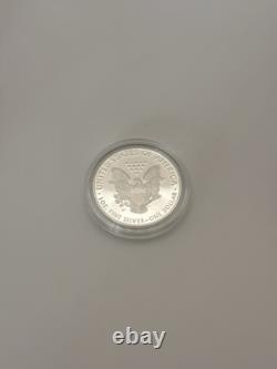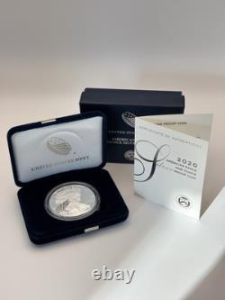 The product is an American Silver Eagle 2020 West Point Proof 1oz Silver Coin with original government packaging and certificate of authenticity. The coin has a fineness of 0.999 and is graded PR 70 by the U. It features the image of an eagle and a shield, with the words "United States of America" and "One Dollar" around the edge.