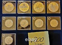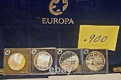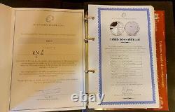 These are all uncirculated proofs in holders and in mint condition. In addition to the coins, you'll receive the collectible presentation box with blue velvet interior and green marble top.This solid silver collection is very impressive! The binder contains certificates of authenticity from the Netherlands Mint for each coin.
